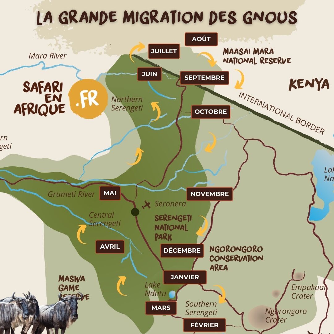 La migration des gnous est un phénomène naturel qui ne connaît pas de frontières. À partir de janvier, les troupeaux se trouvent dans la partie sud du parc national du Serengeti, en Tanzanie. En suivant les pluies (et les plaines herbeuses) vers le nord, ils passent la frontière avec le Kenya vers la fin juillet. Là, ils migrent ensuite par milliers dans les plaines du Masai Mara. Enfin, ils repartent vers le sud, franchissent la frontière et reviennent dans le Serengeti. En tout, ils parcourent une distance totale de pas moins de 800 kilomètres.